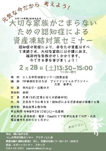 その他公開日:2026年02月01日令和7年度第2回車座集会 大切な家族がこまらないための認知症による資産凍結対策セミナー開催日:2026年02月28日(土)