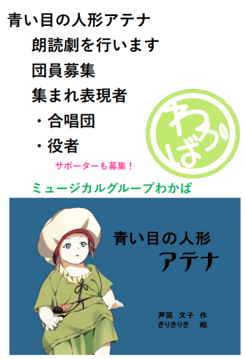 学術・文化・芸術・スポーツの振興公開日:2026年03月01日「⻘い目の⼈形アテナ 朗読劇」 団員募集!開催日:「ミュージカルグループわかば」にお問い合わせください