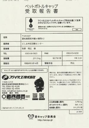 皆さまのおかげで沢山のペットボトルキャップが集まり2026年3月14日、安城市のフジイ化工株式会社様...