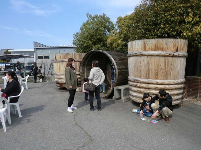 ![]() はと屋駐車場会場では、大きな味噌樽前で一時の休息タイム。 |