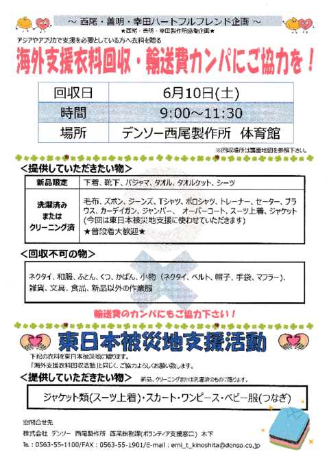 平成29年6月10日(土)9:00~11:30 デンソー西尾製作所 体育館 にて 「海外支援衣料回収・輸送費カンパにご協力を!」が行われました。 「世界の各地で支援を必要としている難民や避難民、被災者に衣料を贈る活動」として、アクティにしおに団体登録している(株)デンソー西尾製作所が毎年行っている社会貢献活動です。西尾製作所で行われるのは、今回4回目だそうです。 約75名のボランティアの方々が参加されており、役割ごと7班に分かれ、受付から搬入までスムーズに対応していらっしゃいました。アクティにしおからも10名の個人ボランティアさんがお手伝いをしてくださいました。 ★「㈱デンソー西尾製作所」さんの団体活動紹介は、トップページ>団体活動紹介>「㈱デンソー西尾製作所」さんで、ご覧いただけます★