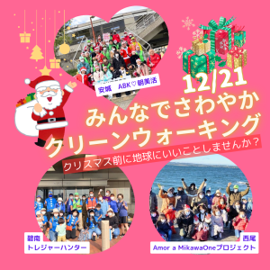 開催日:2025年12月21日(日)開催時間:7:00~竹生排水機場の西側の三河湾の堤防沿い、8:00~ 碧南市役所周辺、13:19~ JR三河安城駅ロータリークリスマス前に地球のためにちょっといいことしませんか? 昨年に引き続き、今年の冬も西尾→碧南→安城...